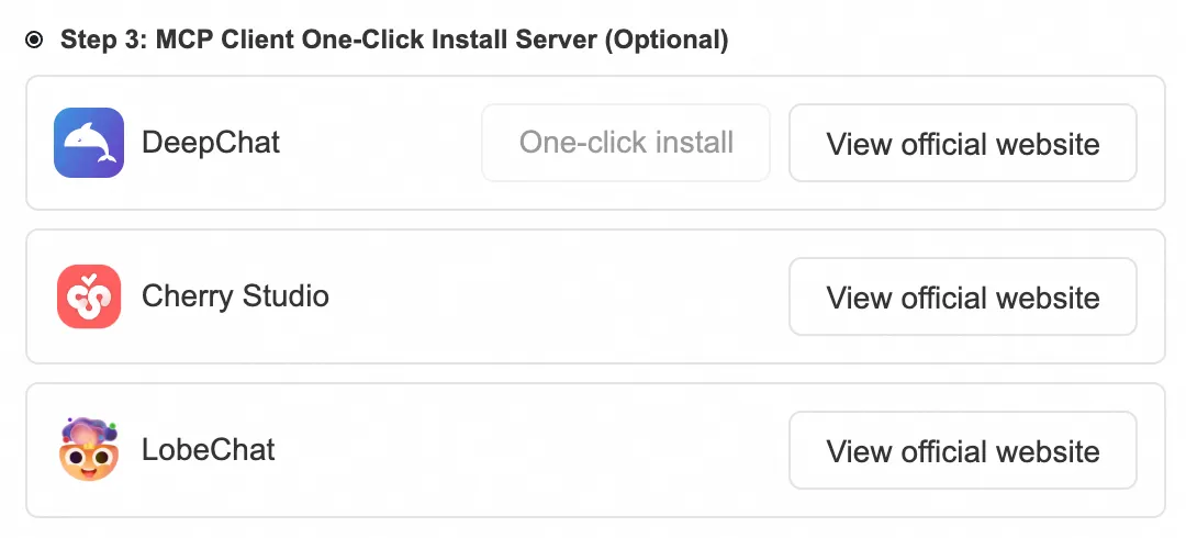 此外,Higress 上线了 MCP 市场,官方维护 50+ Server,确保可用、好用,并持续更新,陆续支持主流开源 Chatbot 客户端的一键安装。