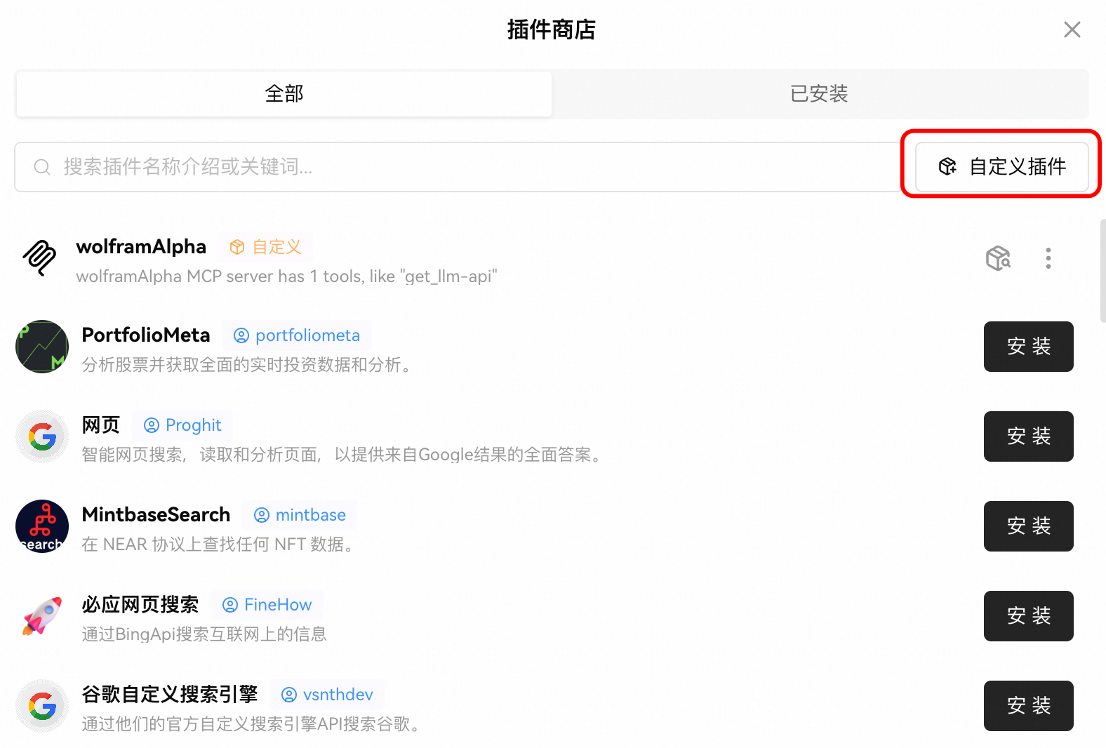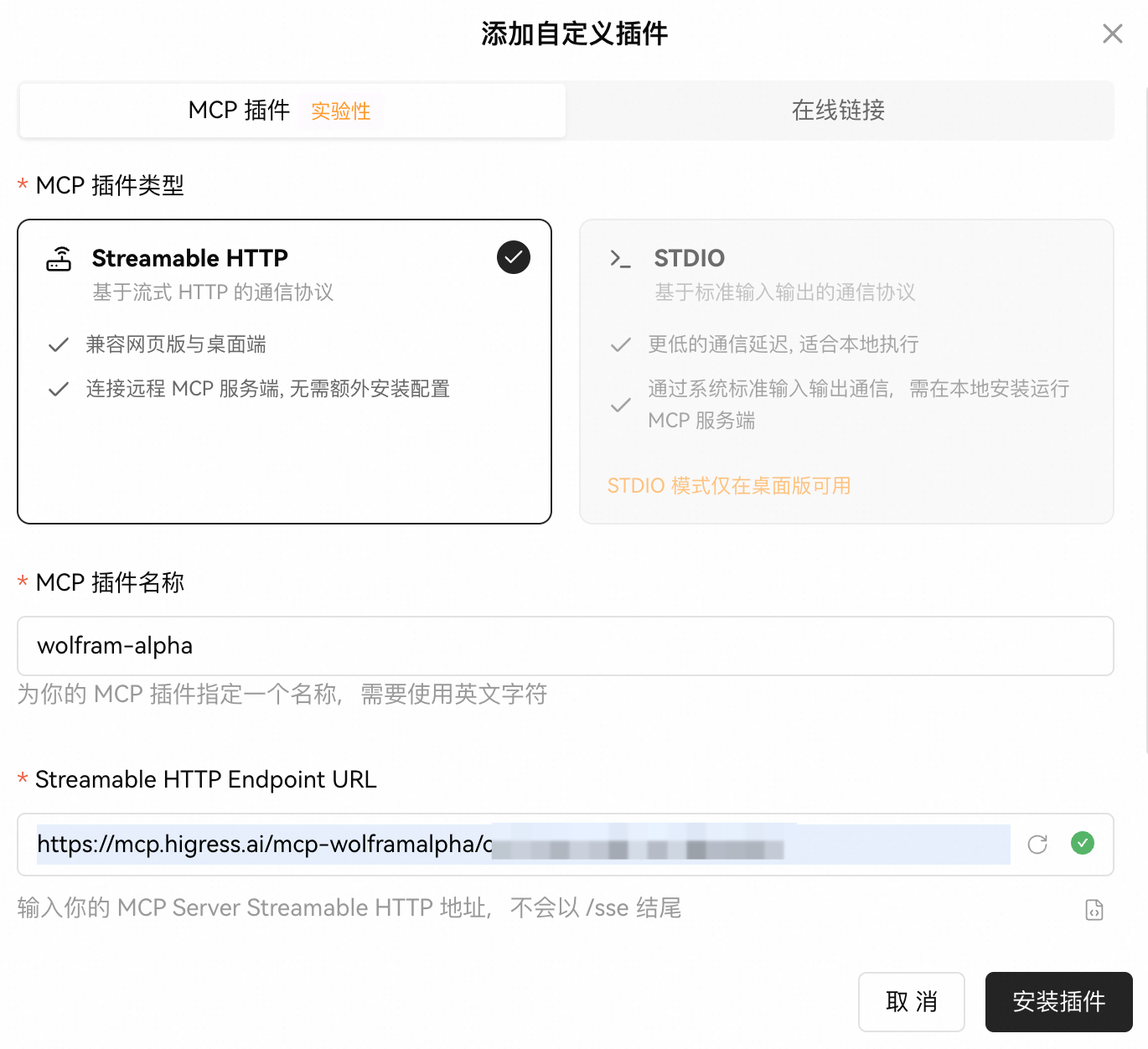 选择MCP插件,并指定Streamable HTTP模式,填写上一步中获取的URL,然后安装插件。