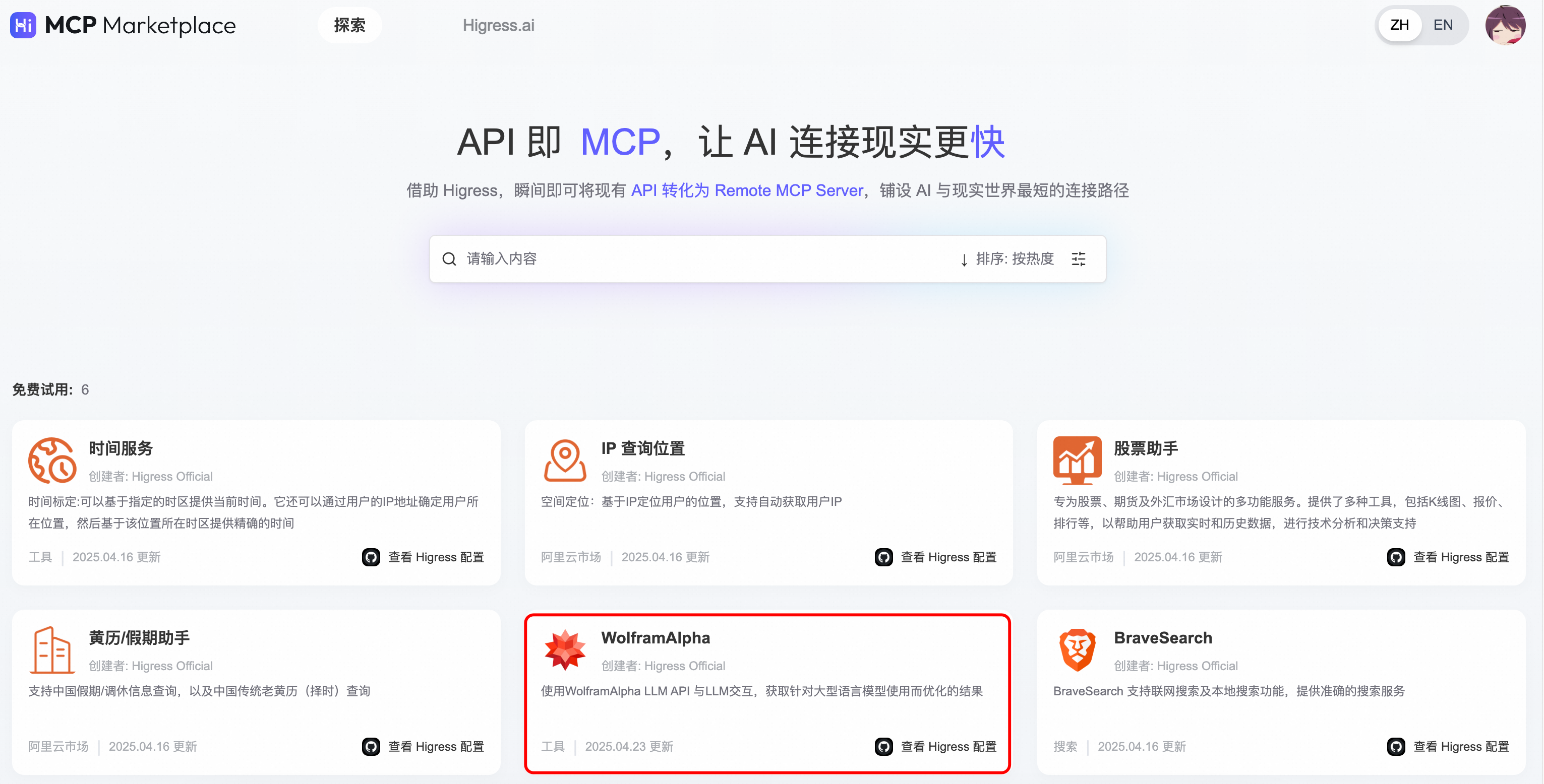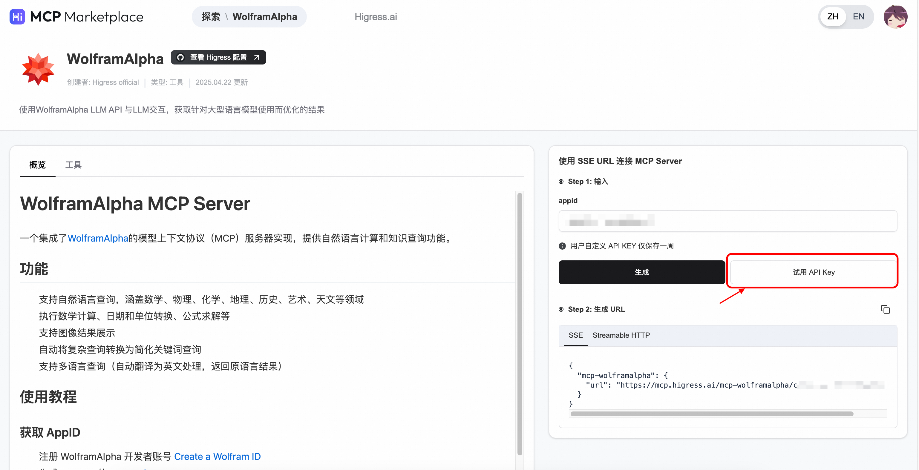 进入 Higress MCP 市场主页:https://mcp.higress.ai/,点击WolframAlpha