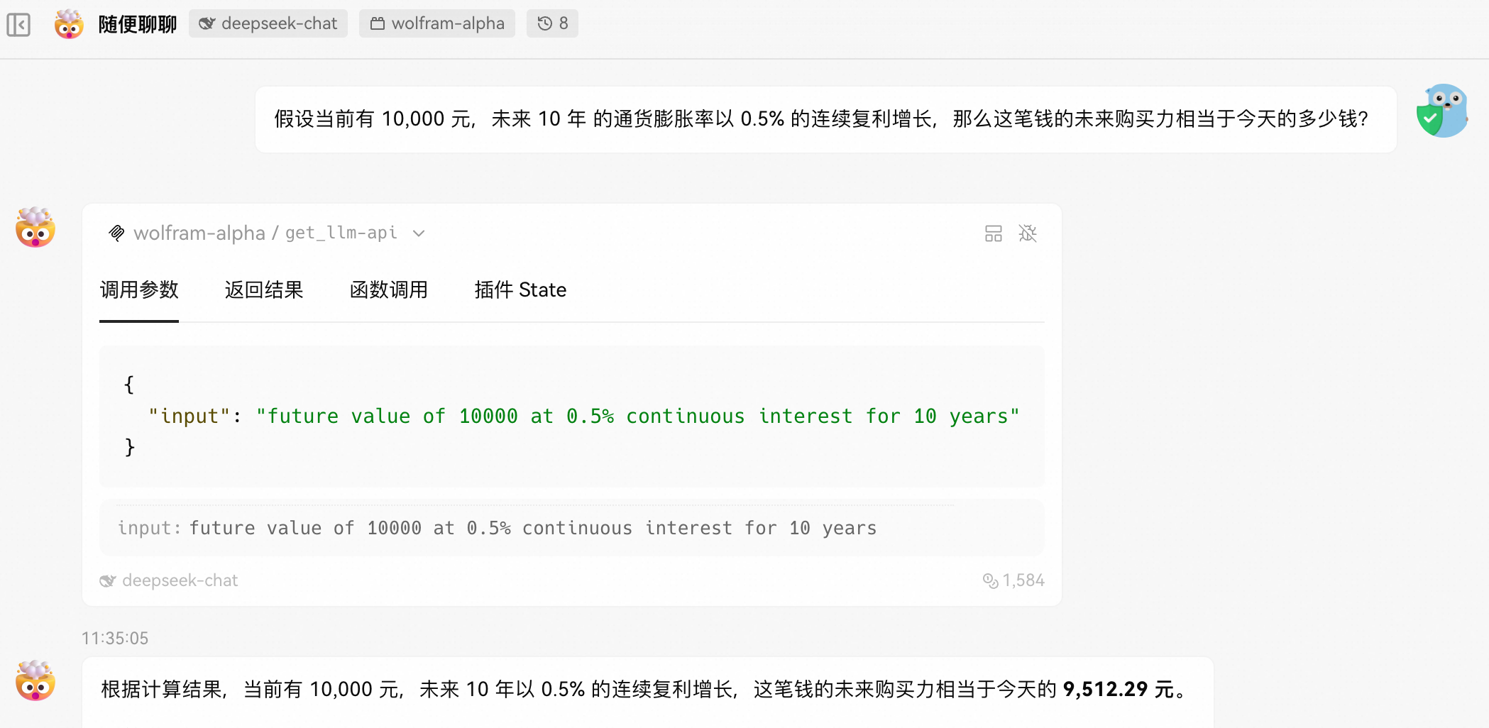 此外,WolframAlpha LLM API 在调用出错的情况下,会根据返回结果来提示更优的提问方式;Agent在接收到类似的指令返回后,也会优化提问方式再次调用工具,从而获取正确的结果。