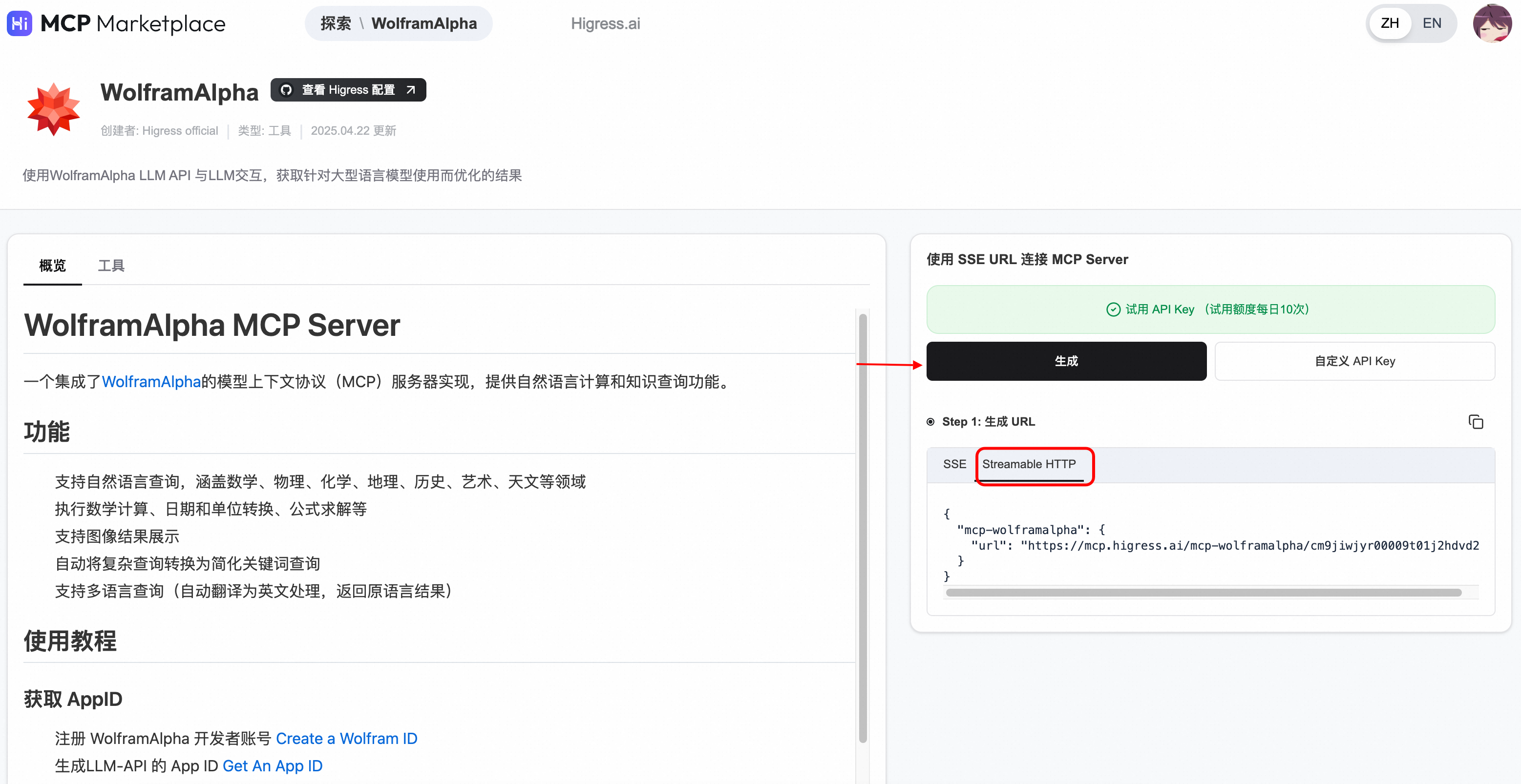进入 Higress MCP 市场主页:https://mcp.higress.ai/,点击WolframAlpha