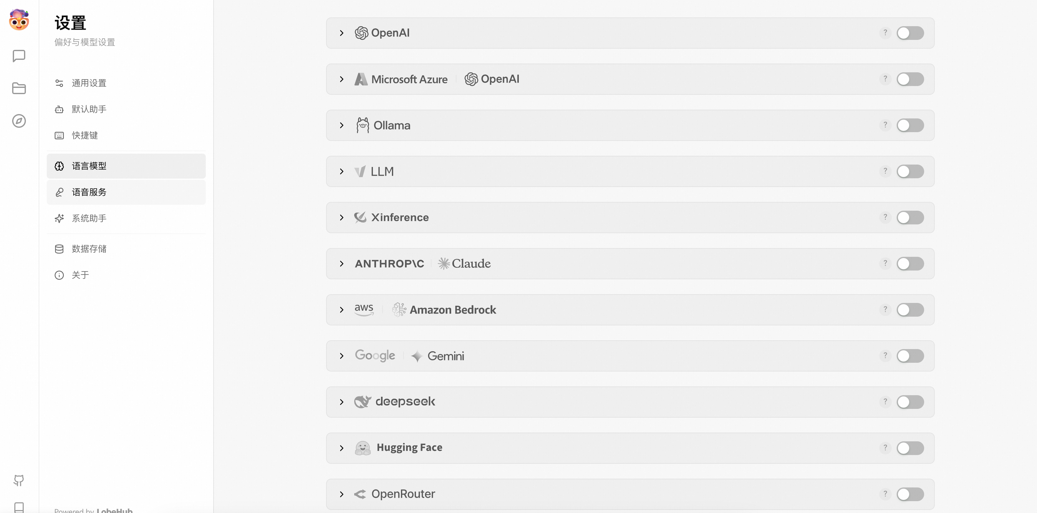 docker run -d -p 3210:3210 \ --name lobe-chat \ lobehub/lobe-chat:1.82.4在设置界面,可以配置不同模型供应商对应的API-KEY。
