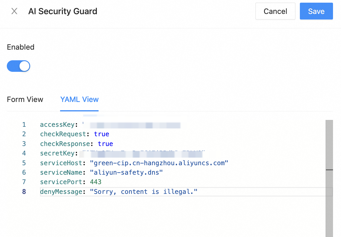 serviceName: aliyun-safety.dns # Created service FQDNservicePort: 443serviceHost: green-cip.cn-hangzhou.aliyuncs.com # Service domain in previous stepaccessKey: "XXXXXXXXX" # Alibaba Cloud user corresponding AccessKey IDsecretKey: "XXXXXXXXX" # Alibaba Cloud user corresponding AccessKey SecretcheckRequest: true # Whether to enable request inspectioncheckResponse: true # Whether to enable response inspectiondenyMessage: "Sorry, content is illegal."