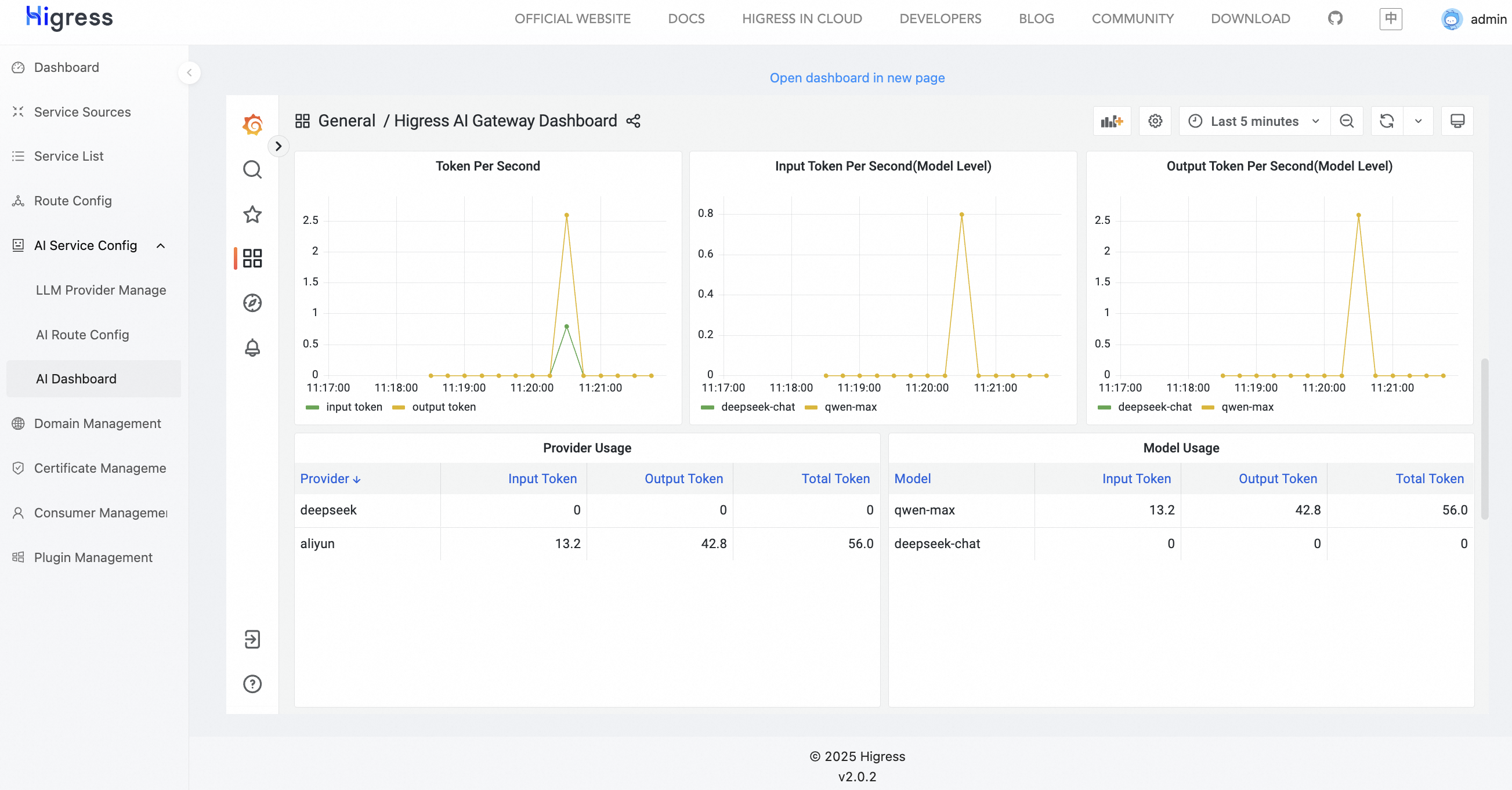 In the AI Dashboard, you can observe AI requests. Observability metrics include the number of input/output tokens per second, token usage by each provider/model, etc.