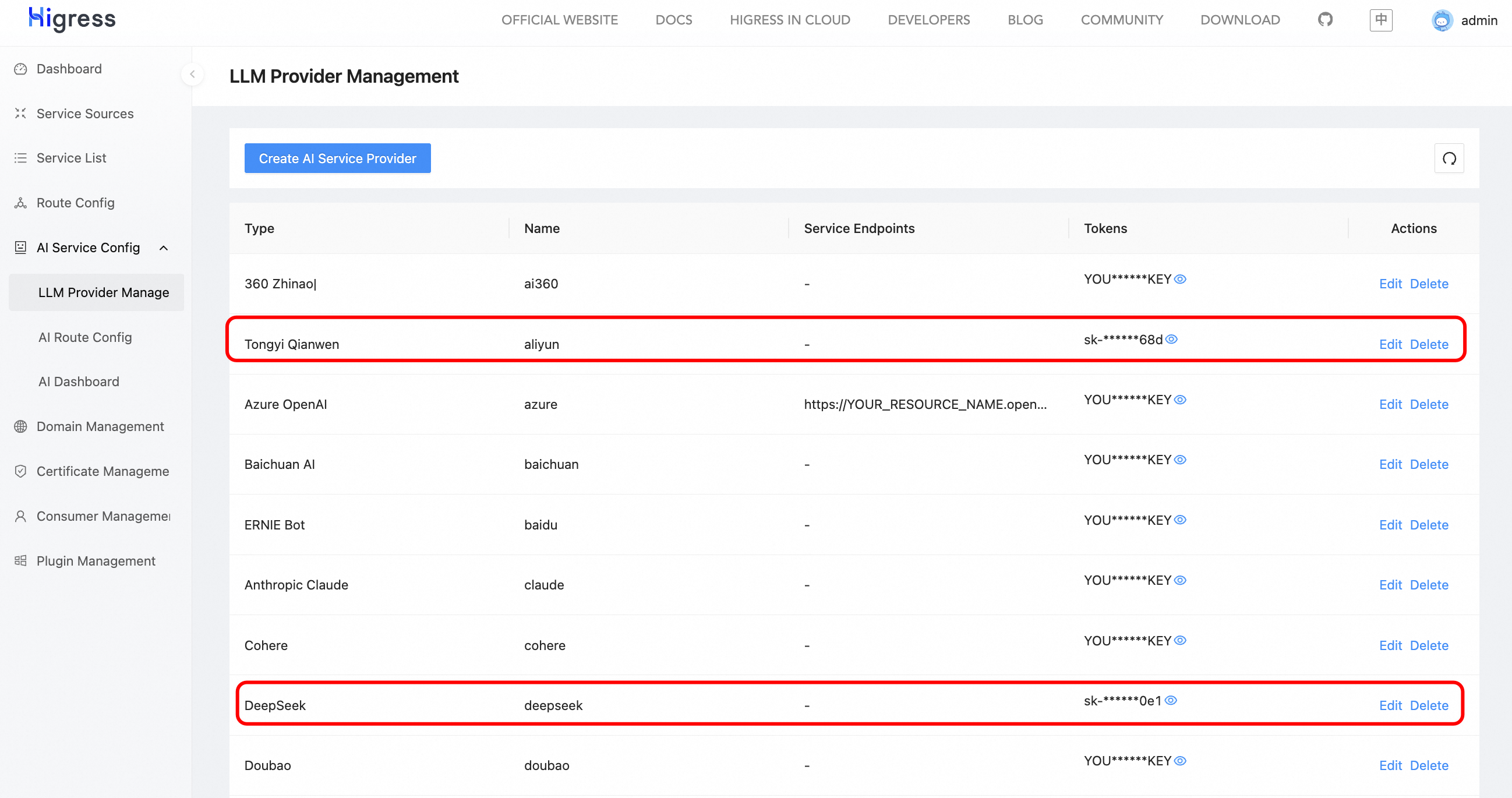 In the LLM Provider Management, you can configure the API-KEYs for integrated suppliers. Currently integrated suppliers include Alibaba Cloud, DeepSeek, Azure OpenAI, OpenAI, DouBao, etc. Here we configure multi-model proxies for Tongyi Qwen and DeepSeek.