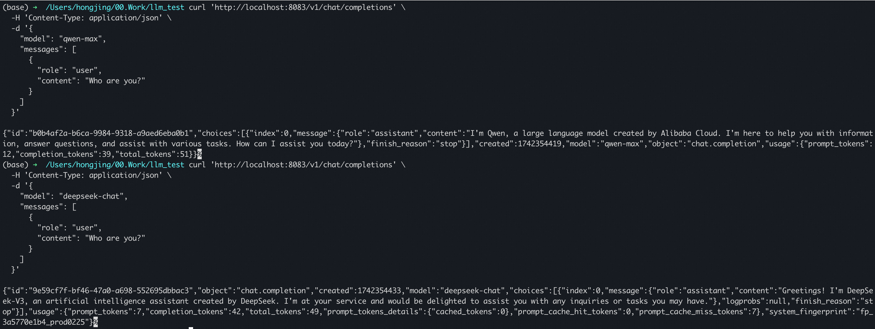 curl 'http://localhost:8080/v1/chat/completions' \ -H 'Content-Type: application/json' \ -d '{ "model": "qwen-max", "messages": [ { "role": "user", "content": "Who are you?" } ] }'Sample response: