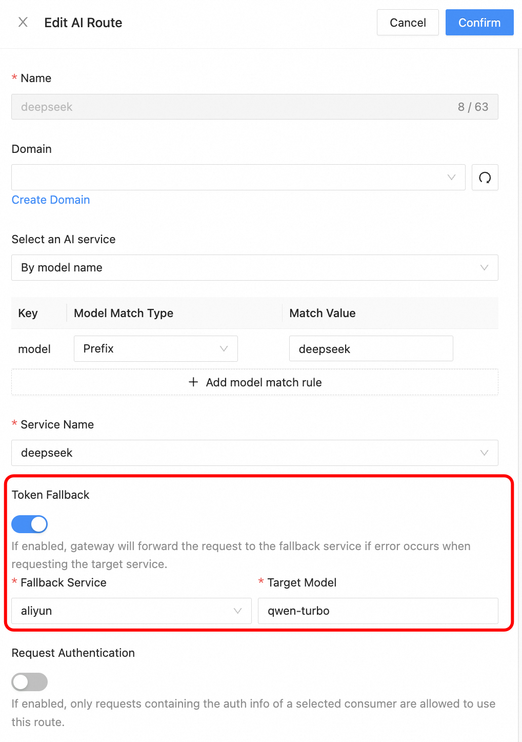 In the AI Route Config, configure the fallback settings for the DeepSeek route. When the request to the target service fails (e.g., due to rate limiting or access failure), it will fallback to the Alibaba Cloud qwen-turbo model.