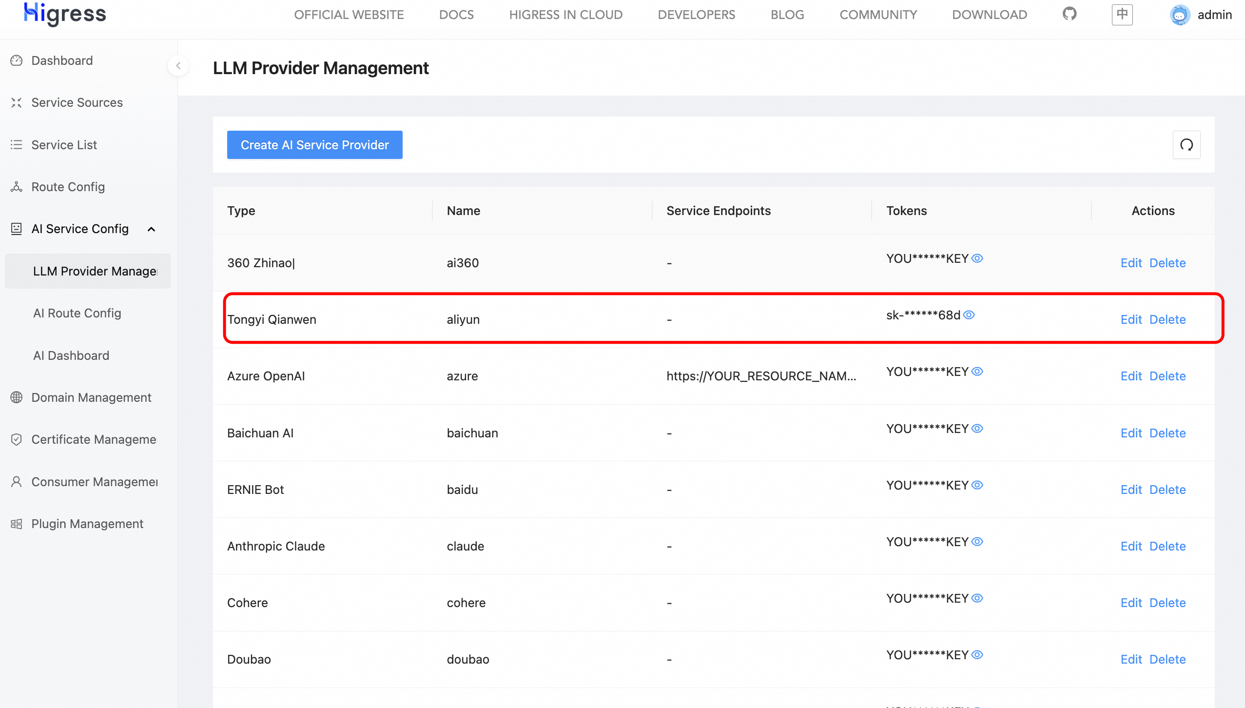In the LLM Provider Management, you can configure the API-KEYs for integrated suppliers. Currently integrated suppliers include Alibaba Cloud, DeepSeek, Azure OpenAI, OpenAI, DouBao, etc. Here we configure multi-model proxies for Tongyi Qwen, which can be ignored if already configured in the previous step.