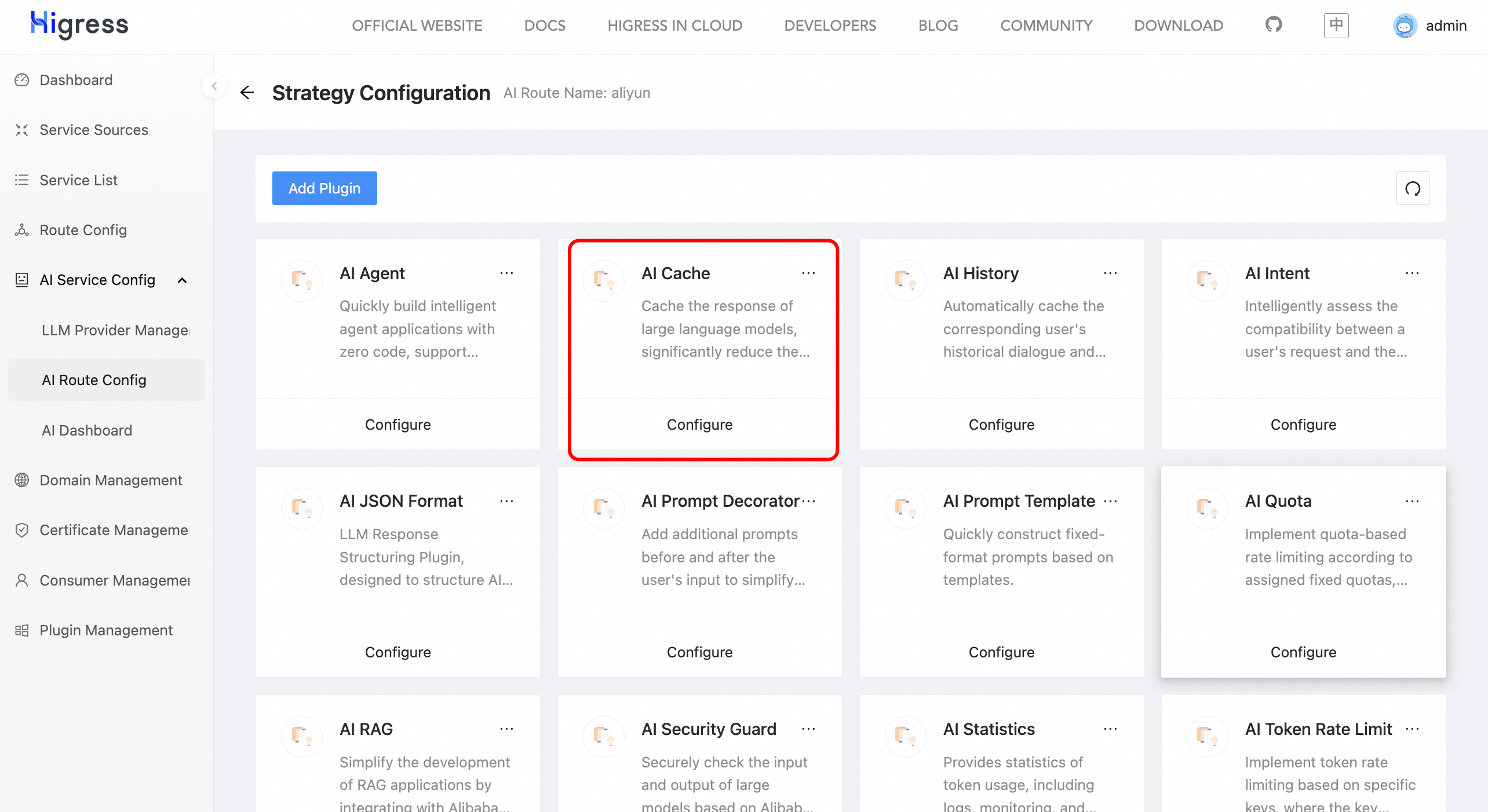 In the AI Route Config, configure strategy for aliyun and select AI Cache.