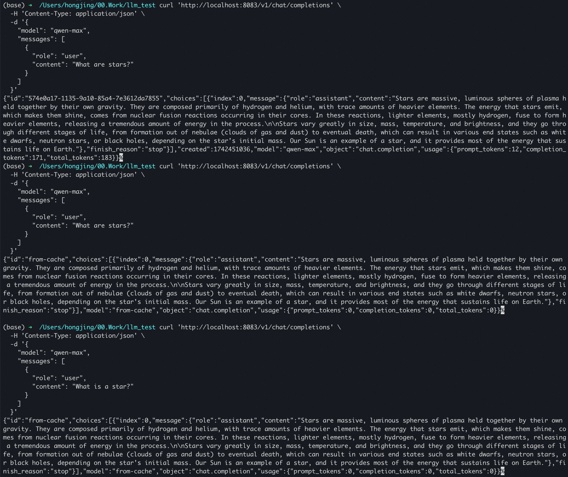 curl 'http://localhost:8080/v1/chat/completions' \ -H 'Content-Type: application/json' \ -d '{ "model": "qwen-max", "messages": [ { "role": "user", "content": "What are stars?" } ] }'You can try the following questions: