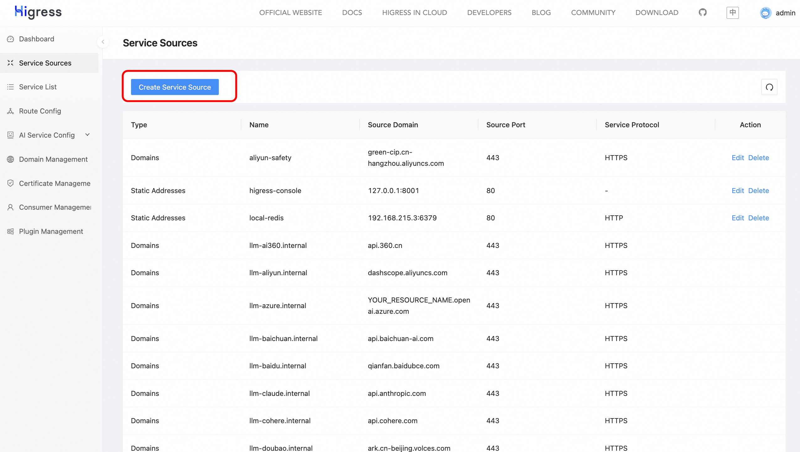 Create a service source in the console’s Service Sources.