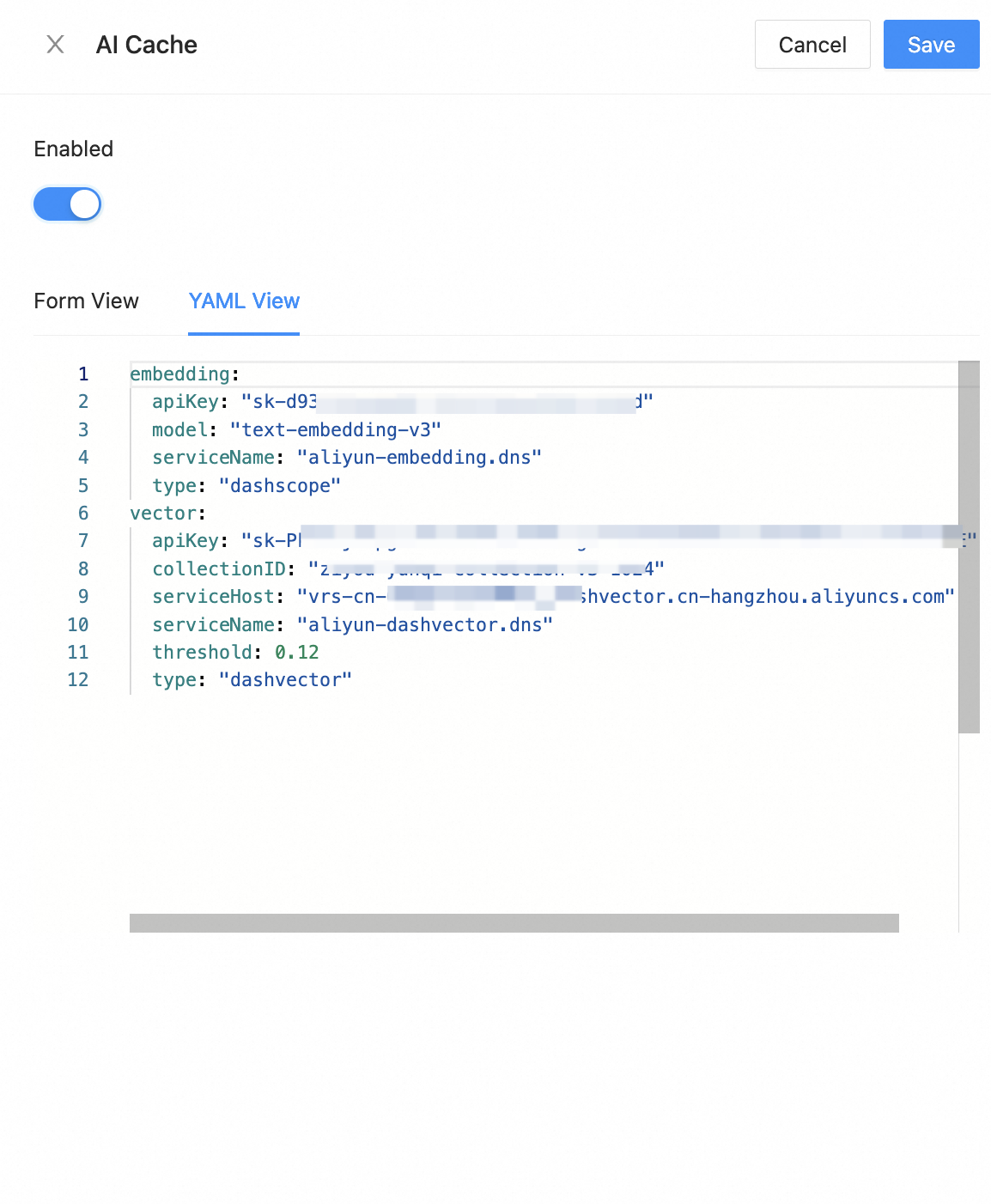 Semantic caching in Higress calls the text embedding service for embedding and the vector database service for vector storage and retrieval. Here, we use Alibaba Cloud BaiLian text-embedding-v3 text embedding service and Alibaba Cloud DashVector vector search service as examples. You need to activate the corresponding services and permissions in Alibaba Cloud console:Alibaba Cloud BaiLian text-embedding, Alibaba Cloud DashVector. Among these, the DashVector requires creating a cluster and a collection for storing embedded vectors. The configuration of the created collection specifies a vector dimension of 1024 (corresponding to text-embedding-v3) and a distance metric of Cosine.