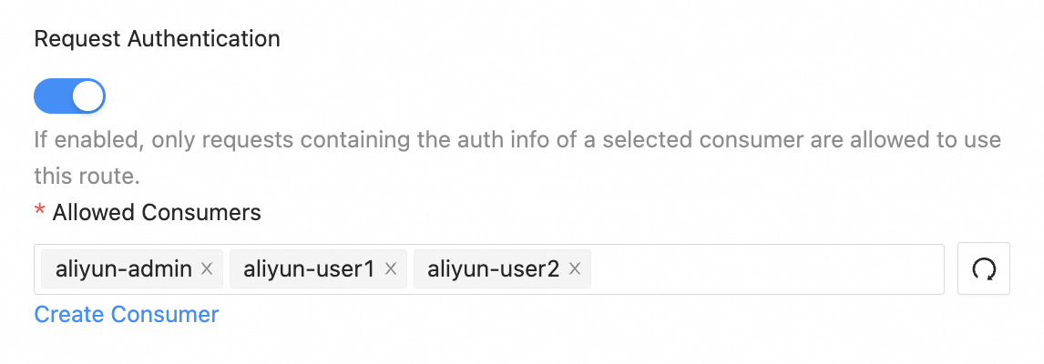 Click to create a consumer, and based on Key Auth, create three consumers named aliyun-admin, aliyun-user1, and aliyun-user2. Authentication is performed based on the x-api-key field in the HTTP Header.