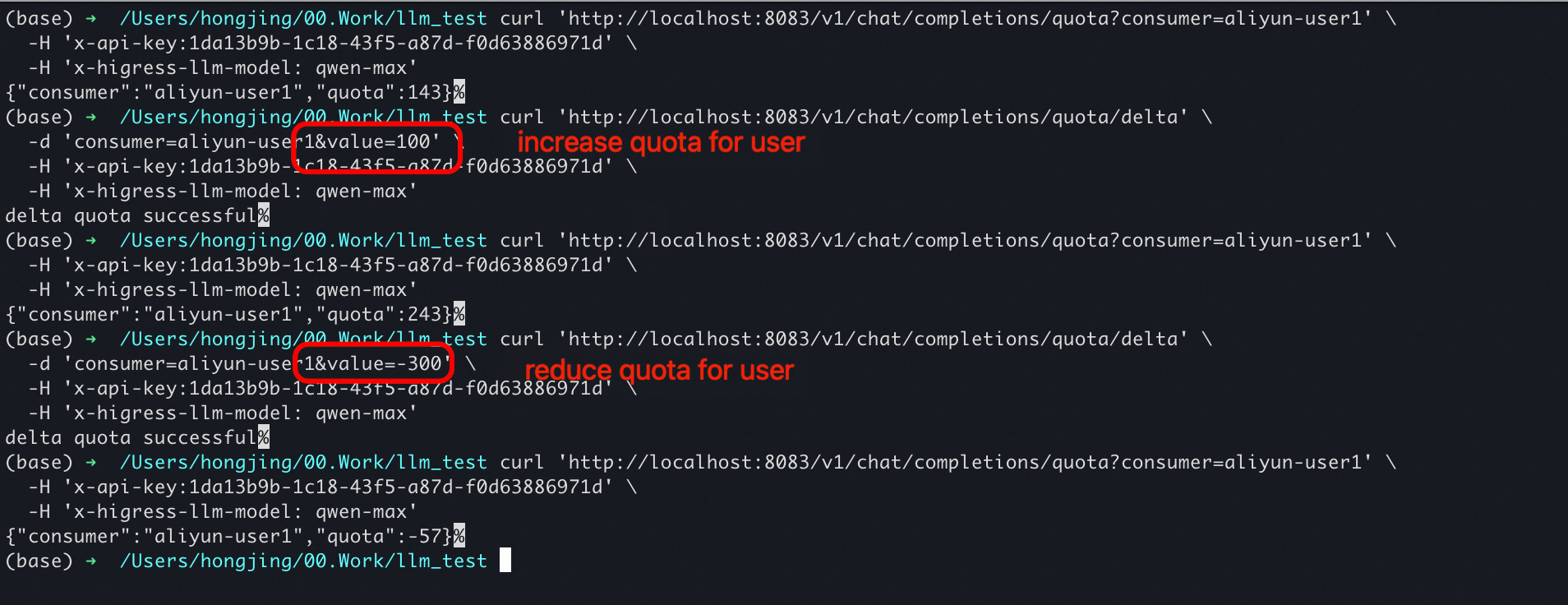 # Increase quota, x-api-key is the credential for aliyun-admincurl 'http://localhost:8080/v1/chat/completions/quota/delta' \ -d 'consumer=aliyun-user1&value=100' \ -H 'x-api-key:xxxxxxxxxxxx' \ -H 'x-higress-llm-model: qwen-max'