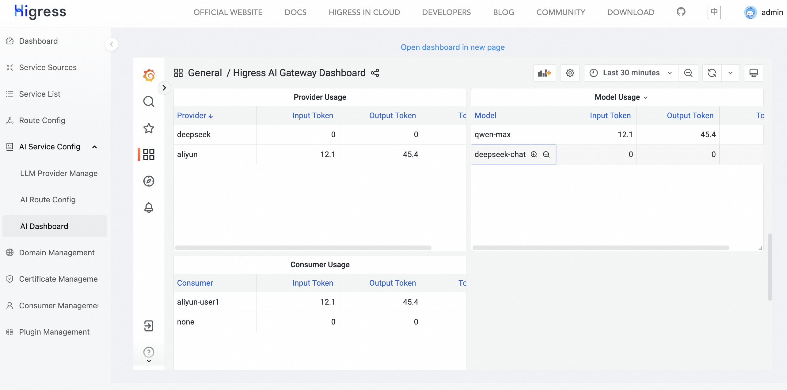 In the AI Dashboard, you can observe AI requests. Observability metrics include the number of input/output tokens per second, token usage by each provider/model, and the token usage of consumers etc.