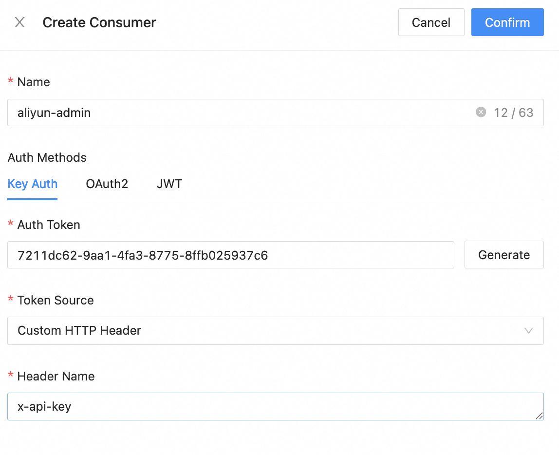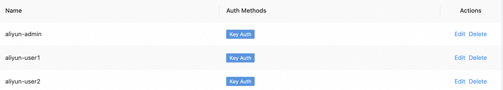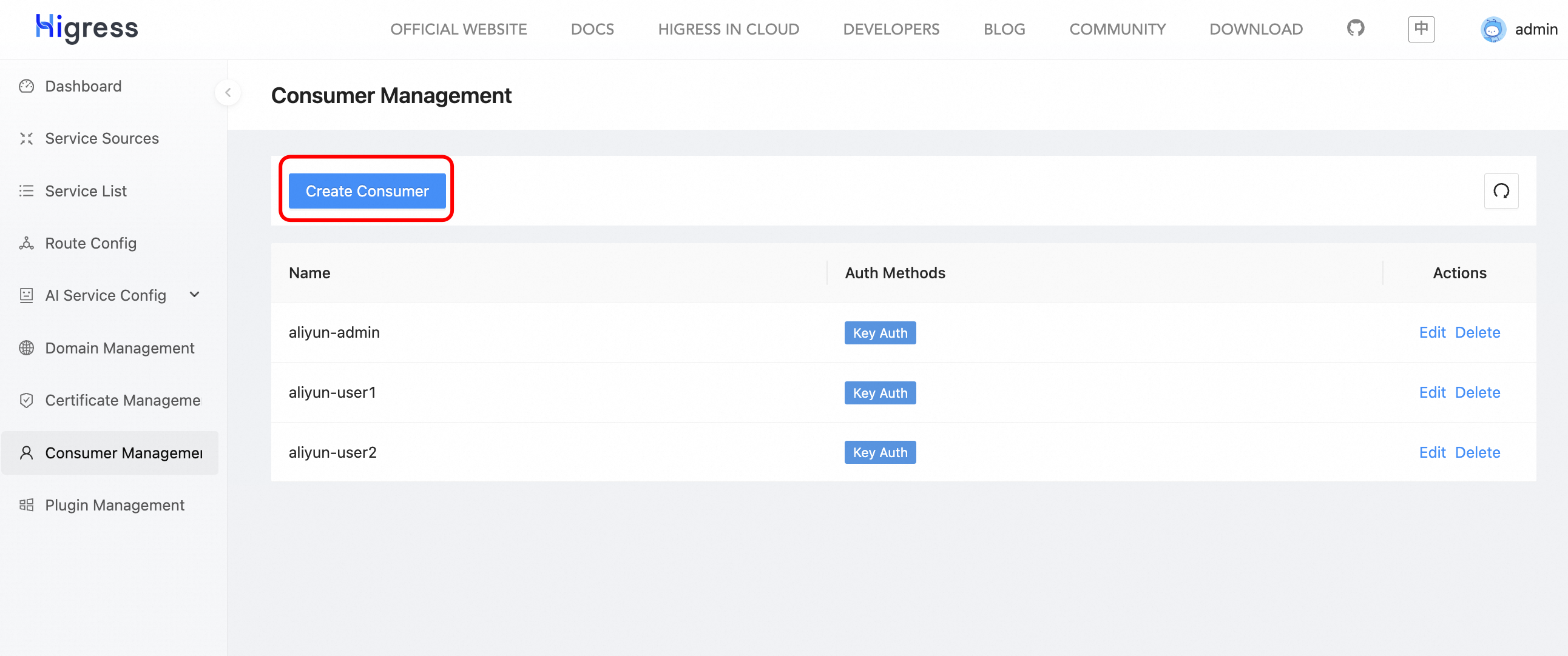 Click to create a consumer, and based on Key Auth, create three consumers named aliyun-admin, aliyun-user1, and aliyun-user2. Authentication is performed based on the x-api-key field in the HTTP Header.