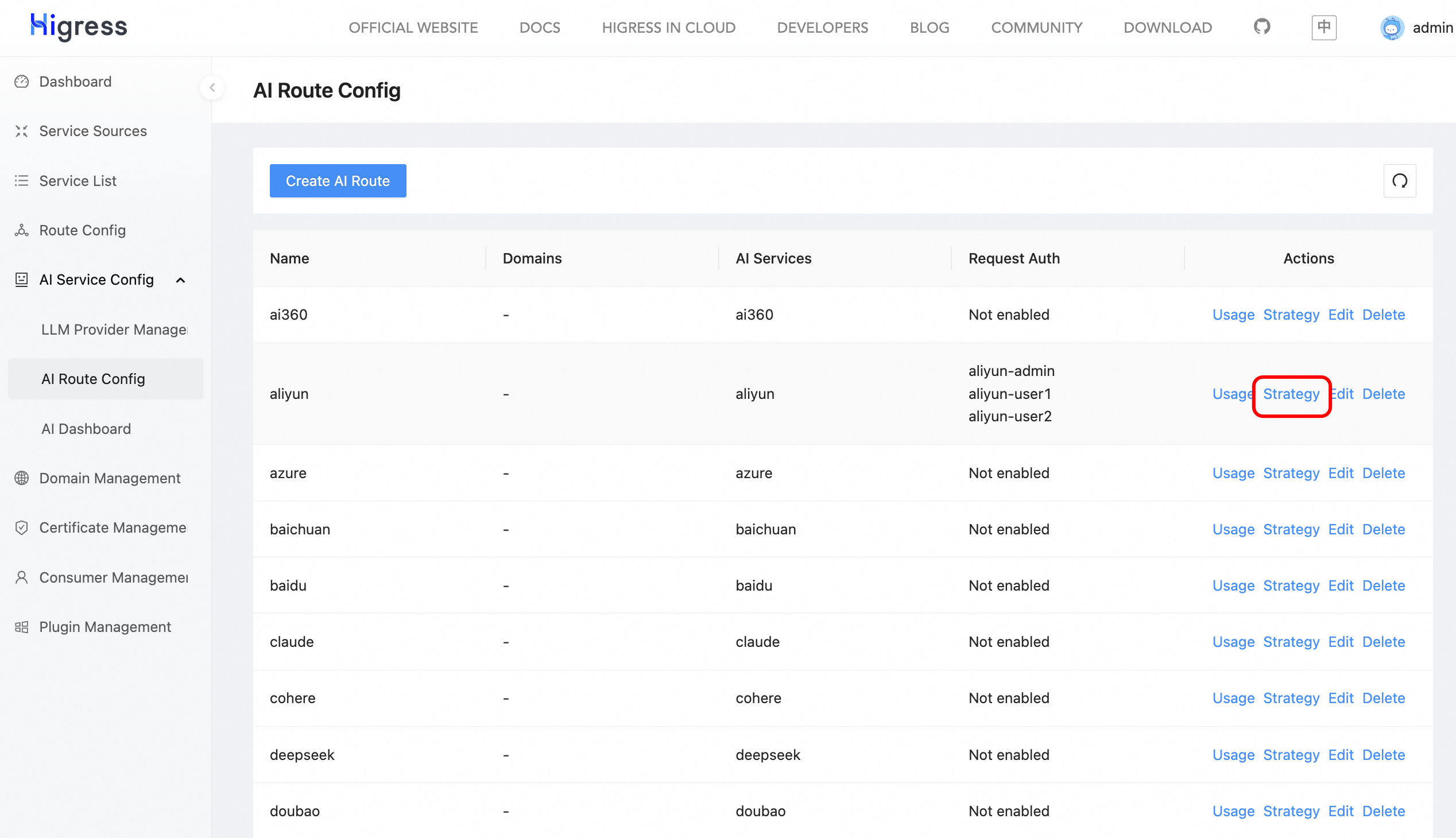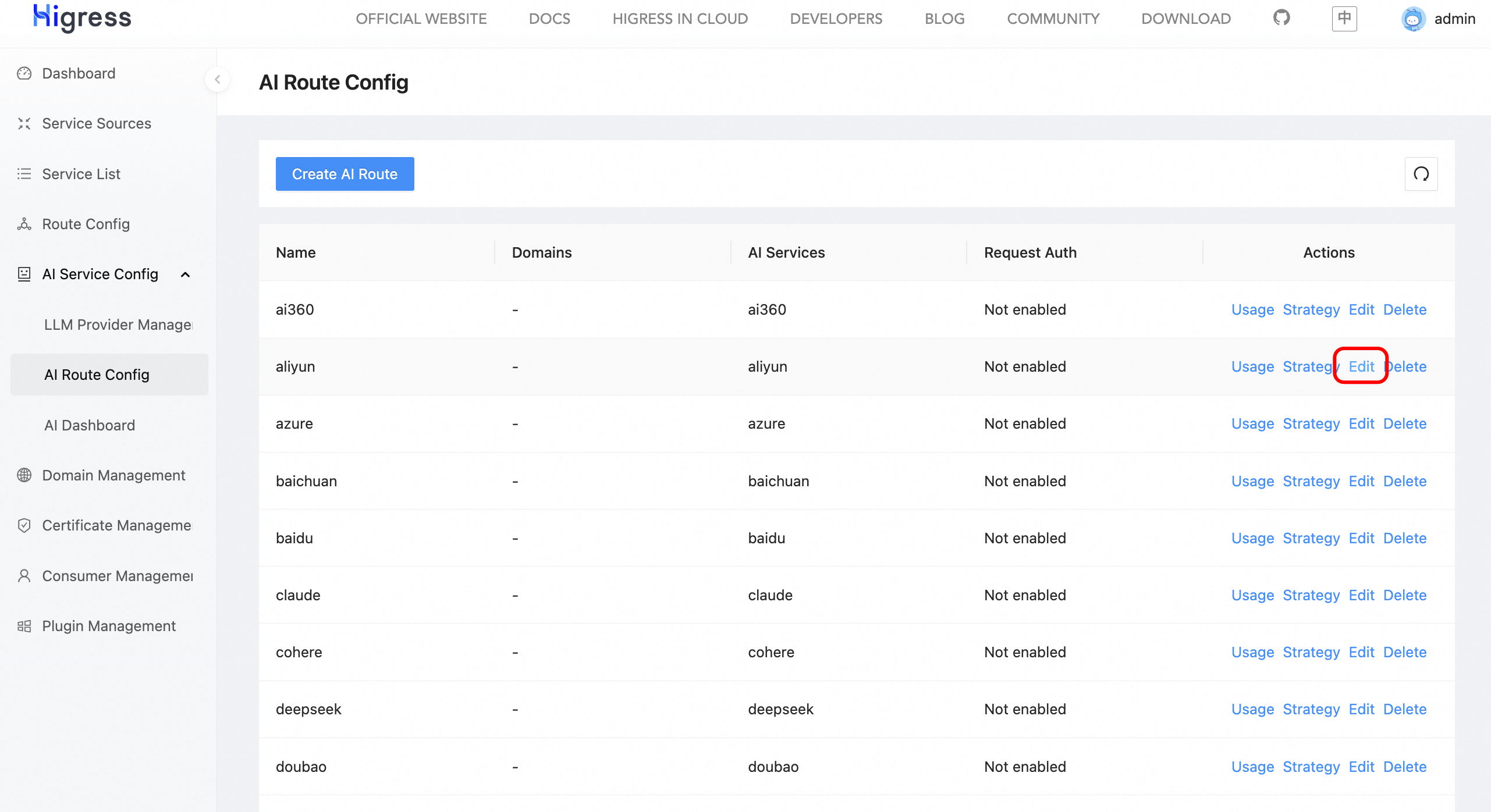 In the AI Route Config, configure consumers for aliyun and click Edit.