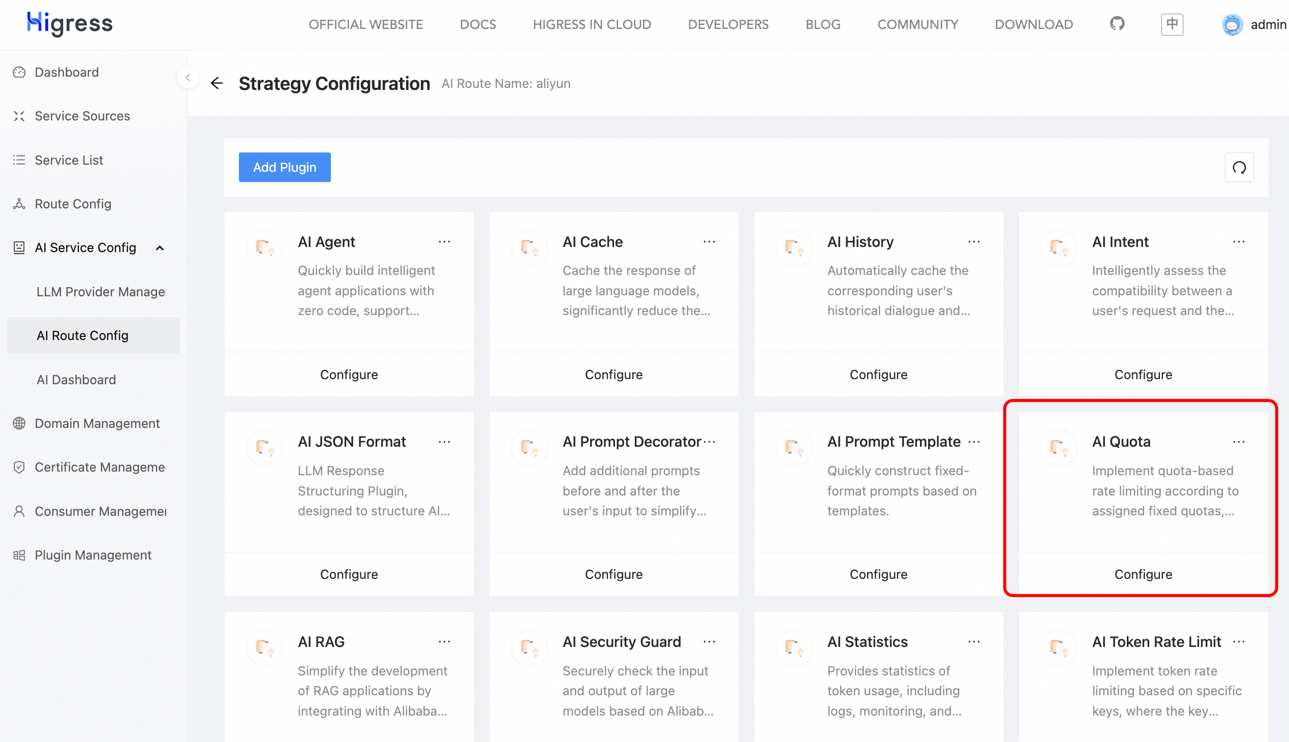 In the AI Route Config, click Edit and configure AI Quota for aliyun .