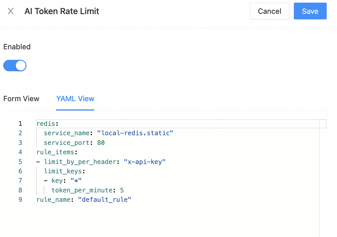 rule_items:- limit_by_per_header: x-api-key limit_keys: - key: "*" token_per_minute: 5 # Limit to 5 tokens per minuterule_name: "default_rule"
