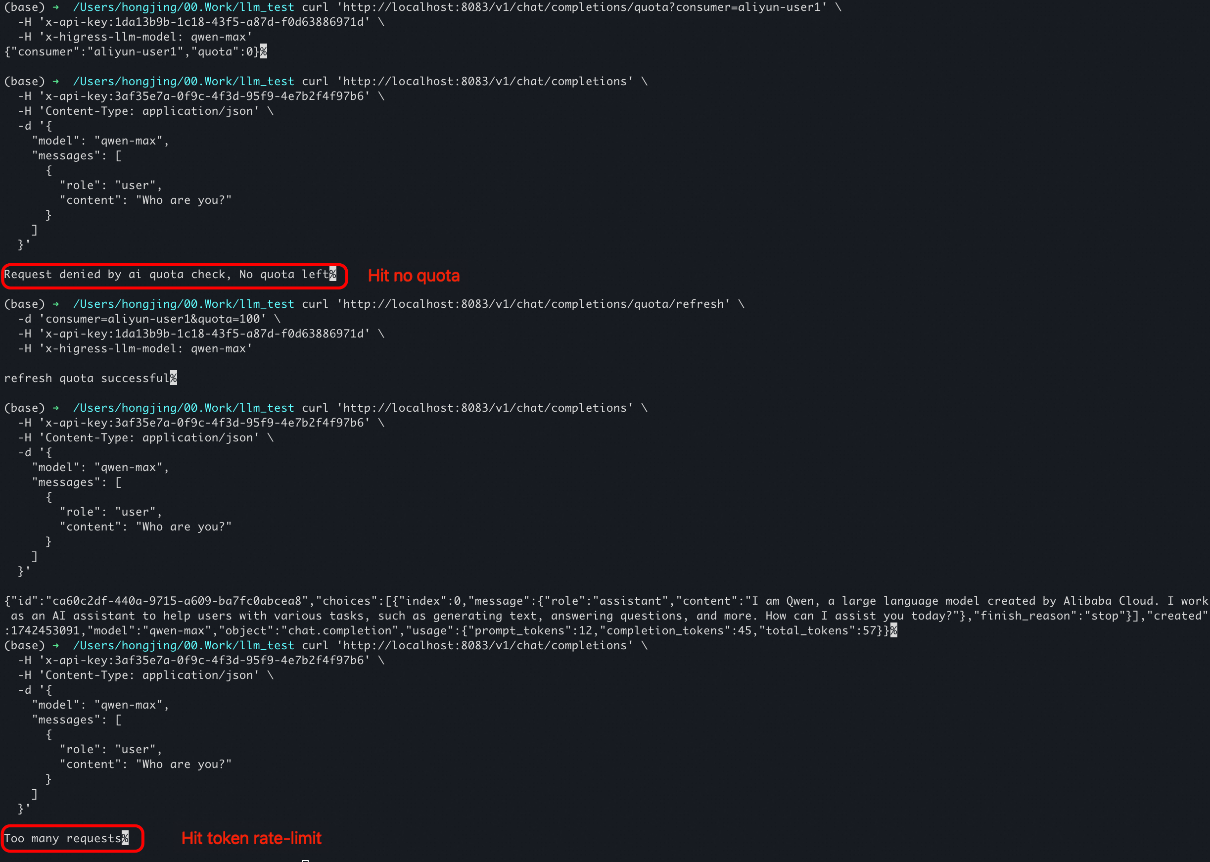 # Query quota, x-api-key is the credential for aliyun-admincurl 'http://localhost:8080/v1/chat/completions/quota?consumer=aliyun-user1' \ -H 'x-api-key:xxxxxxxxxxxx' \ -H 'x-higress-llm-model: qwen-max'