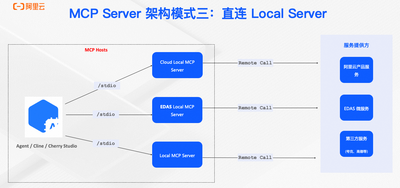 这种架构就像你家里有个私人助理 —— MCP Client通过STDIO方式直接连接本地MCP Server,进程间直接通信。