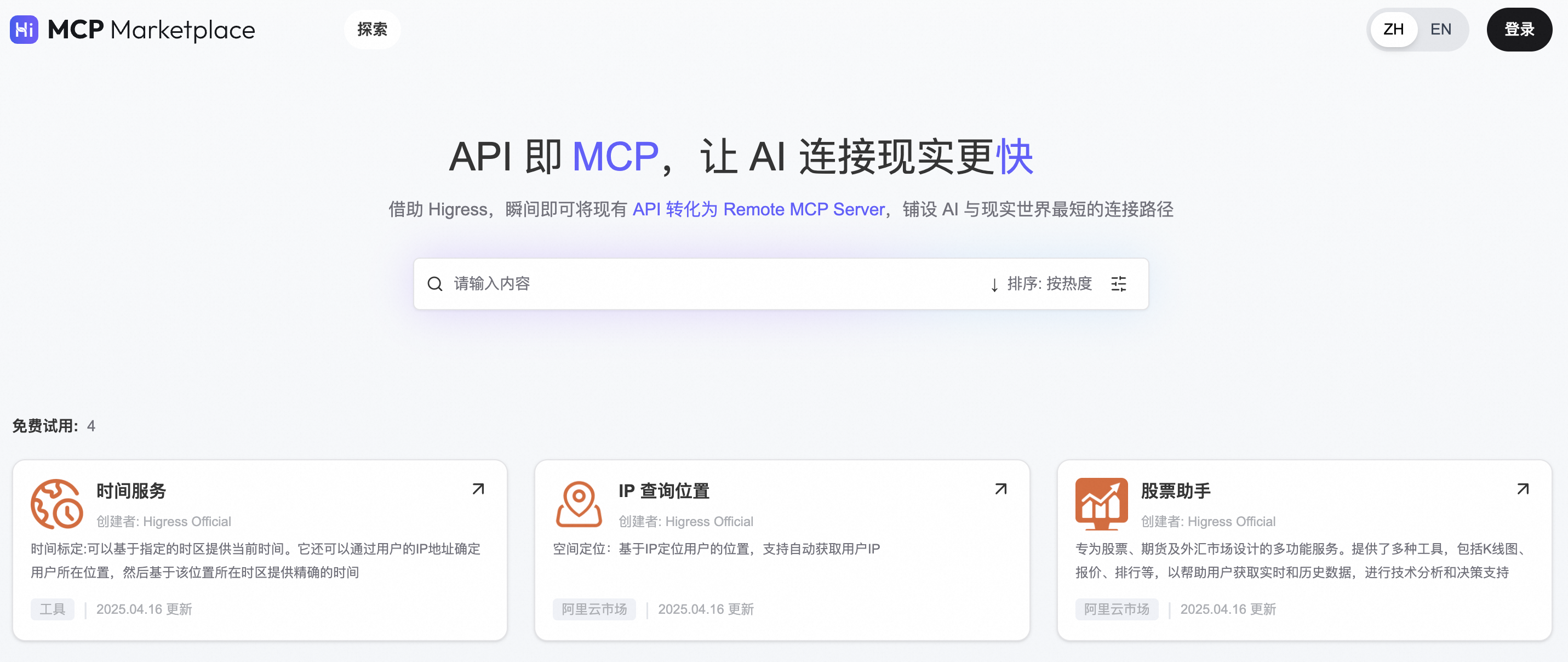 - **存量 API 快速转化为 MCP Server:**用户无须从0开始构建,即 Higress Marketplace 面向的是拥有大量存量 API 的企业,希望快速享受 MCP 的红利。