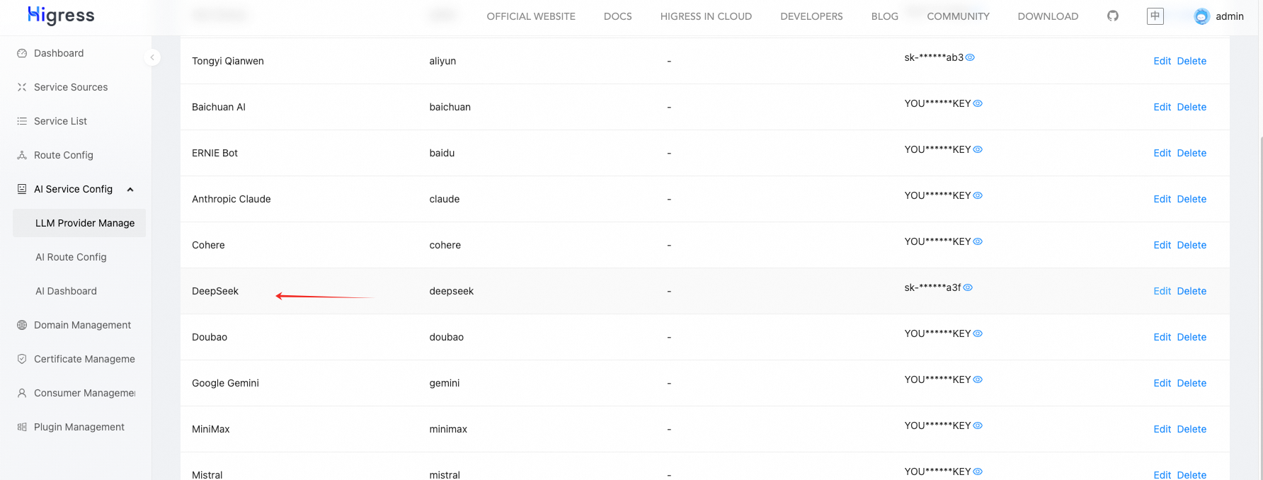 可能你在安装 Higress 时没有填写 DeepSeek 的 API Key,那么可以在这里进行配置