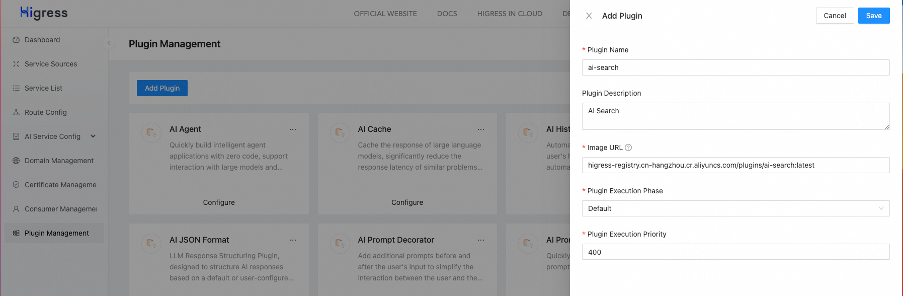 注意插件OCI镜像地址填写:higress-registry.cn-hangzhou.cr.aliyuncs.com/plugins/ai-search:latest
